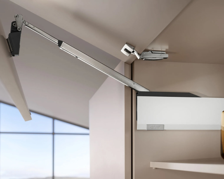 AVENTOS HF top - новое поколение складных подъемников AVENTOS. При открывании фасады складываются, ручка легко доступна в любой позиции. Фасады могут быть разной высоты, но в случае асимметричных фасадов больший фасад должен быть сверху! Механизм подъёмника позволяет остановить его в любом положении. BLUMOTION обеспечивает мягкое и бесшумное закрывание. Разметка позиции установки механизма и монтаж фасадов осуществляются без инструментов. Ограничитель угла открывания встроен в механизм. Удобная и бесступенчатая 3- мерная регулировка.