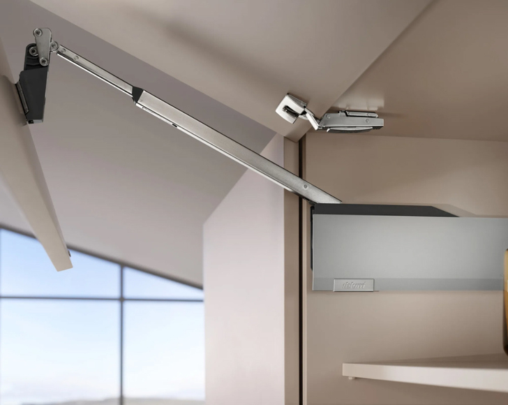 AVENTOS HF top - новое поколение складных подъемников AVENTOS. При открывании фасады складываются, ручка легко доступна в любой позиции. Фасады могут быть разной высоты, но в случае асимметричных фасадов больший фасад должен быть сверху! Механизм подъёмника позволяет остановить его в любом положении. BLUMOTION обеспечивает мягкое и бесшумное закрывание. Разметка позиции установки механизма и монтаж фасадов осуществляются без инструментов. Ограничитель угла открывания встроен в механизм. Удобная и бесступенчатая 3- мерная регулировка.